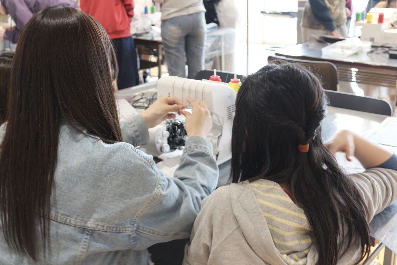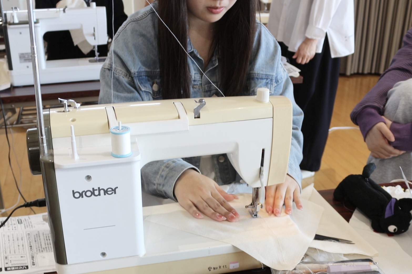 講師の先生に指導して頂き、ミシンの糸の掛け方や縫い方を教わりました。